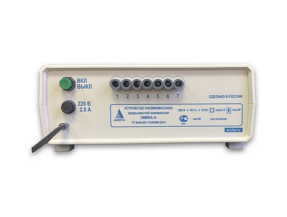 Устройство пневмомассажа прерывистой компрессии «Лимфа-Э-2» с принадлежностями по ТУ 9444−001−11 292 980−2014 (далее — пневмомассажер) предназначено для профилактики и лечения нарушений кровообращения и лимфообращения.Пневмомассажер является изделием медицинской техники и может использоваться в медицинских и спортивных учреждениях, а также по рекомендации врача в домашних условиях, в комнатах отдыха и реабилитации.
