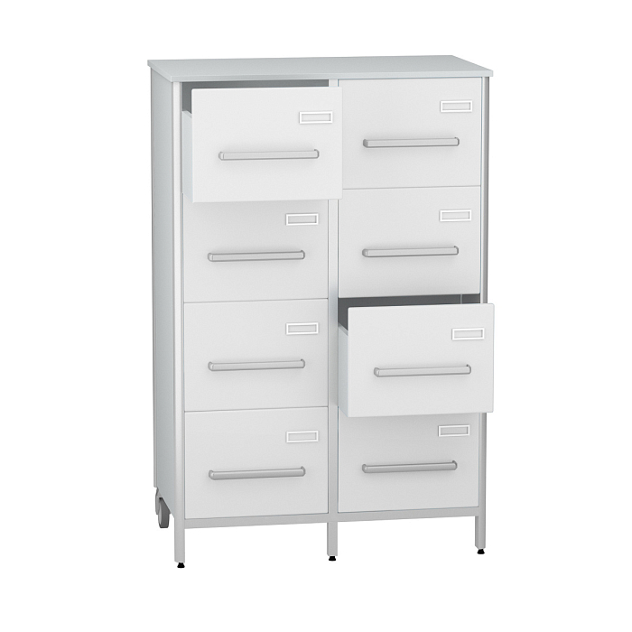 Мебель с вертикальной несущей конструкцией из алюминиевого профиля с наполнением панелями из ЛДСП. Особенность данной серии – наличие колесных опор сзади, что позволяет с минимальными усилиями передвигать изделия по помещениям. Используется в кабинетах врача и других административных помещениях медицинских и иных учреждений.