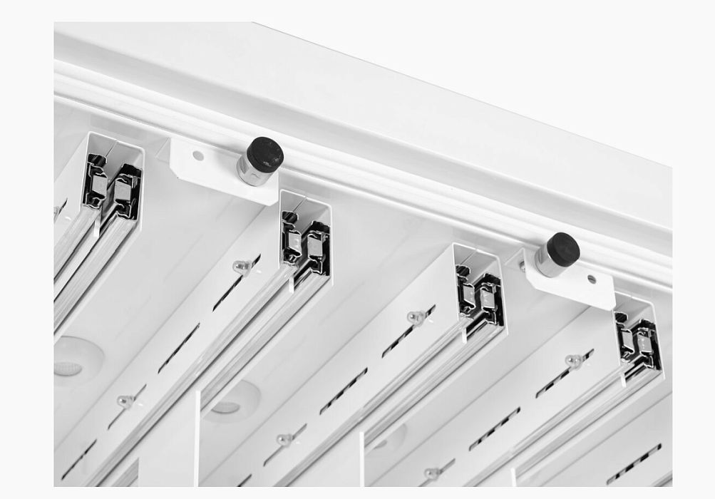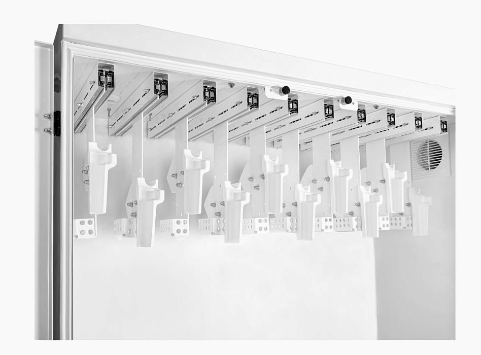 Шкаф EC-10BD- асептическое хранение и ускоренная сушка до десяти эндоскопов благодаря подогреву циркулирующего воздуха и одновременной продувке каналов. УФ-обработка и фильтрация воздуха обеспечивают стерильность. Конструкция предусматривает раздельные отсеки (рабочий, технический, воздухоподготовки) с индивидуальными дверцами. Эффективная циркуляция воздуха достигается за счет встроенных вентиляторов, обеспечивающих направленный поток чистого и обработанного воздуха.