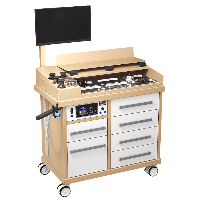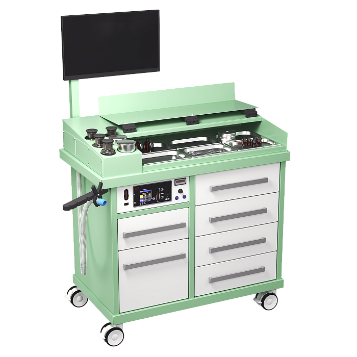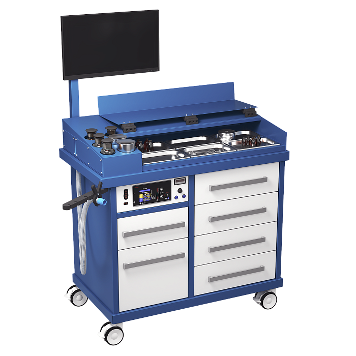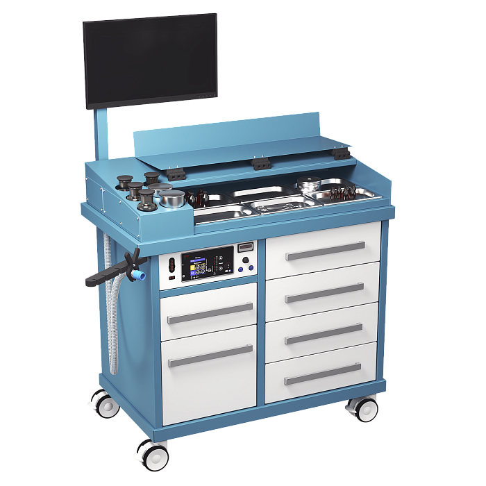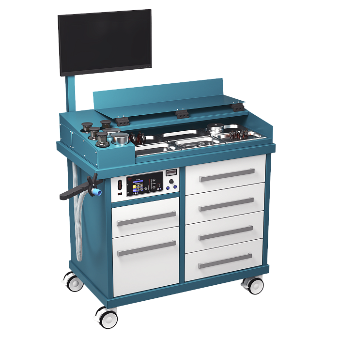 - Верхняя консоль с крышкой: Металлическая консоль с верхней крышкой и наполненным каскадом съёмных лотков, расположена на столешнице модуля тумбы