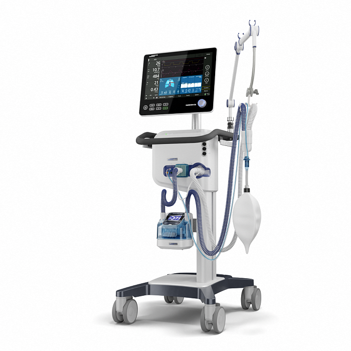 Новейший аппарат ИВЛ с турбинным приводом не зависит от источников сжатого воздуха и весит как минимум на 10 кг меньше, что делает его более мобильным. Эту модель аппарата можно легко транспортировать в пределах медицинского учреждения, поскольку она небольшого размера, оснащена аккумулятором, держателем для двух кислородных баллонов и улучшенными колесами тележки. Она также хорошо подходит для ранней мобилизации пациентов.