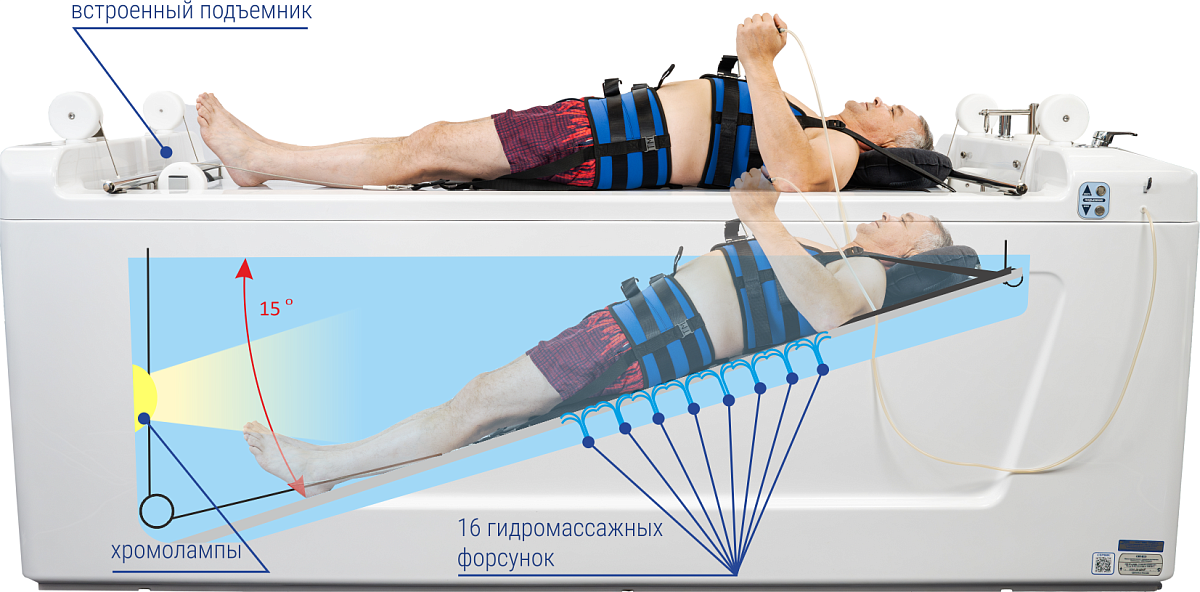 - Наклонное дно. Обеспечивает наиболее правильное положение пациента во время вытяжения, сокращает необходимый объем воды и позволяет полностью погрузить пациента в воду.