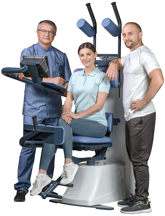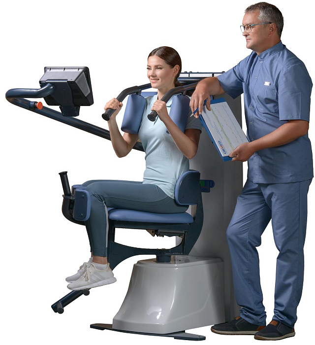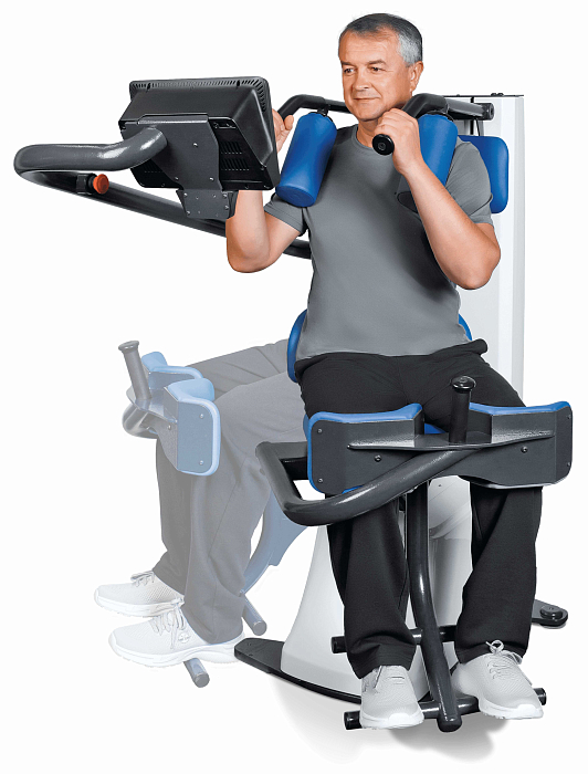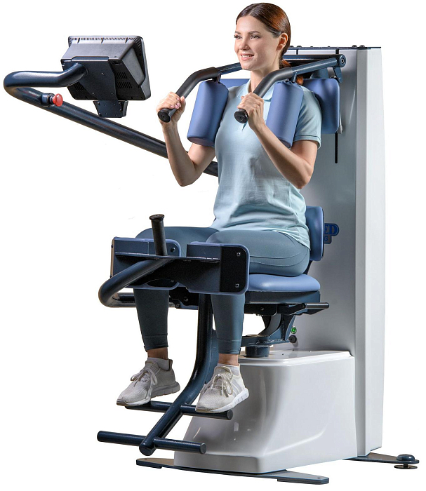 Для тестирования и активной реабилитации заболеваний позвоночника. Направляет нагрузку на мышцы поясничного и грудного отделов позвоночника, активируя вращательные мускулы. Прорабатываются наружные и внутренние косые мышцы живота. Механизмы фиксации верхней и нижней частей туловища обеспечивают изолированное вращательное движение. Особенности тренажера: при идентификации — автоматическая подстройка под пациента уровня сиденья, ширины прижимов плеч с помощью электропривода. Возможность проведения круговой тренировки.
