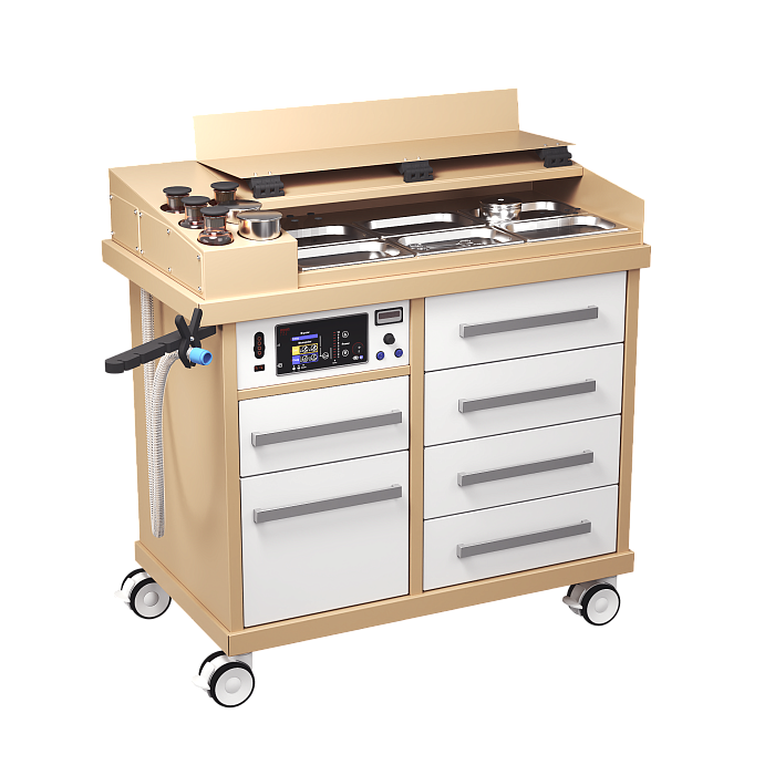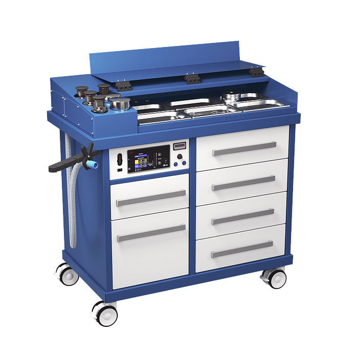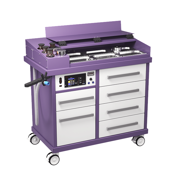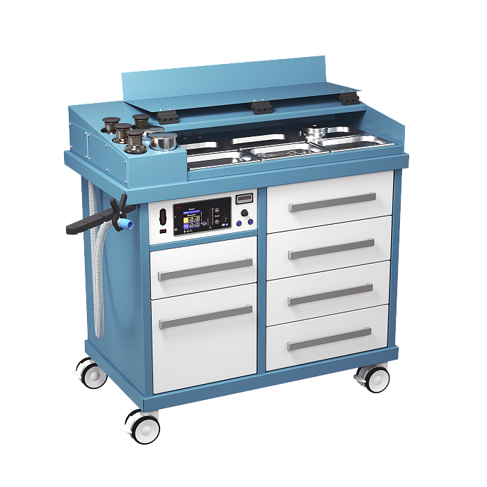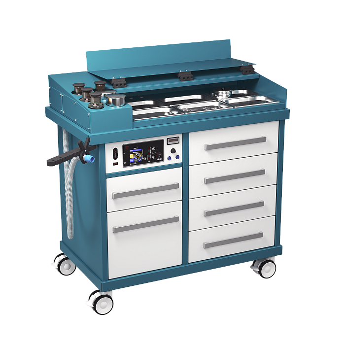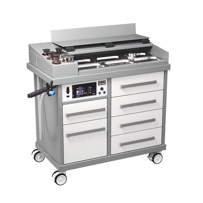 - Верхняя консоль с крышкой: Металлическая консоль с верхней крышкой и наполненным каскадом съёмных лотков, расположена на столешнице модуля тумбы