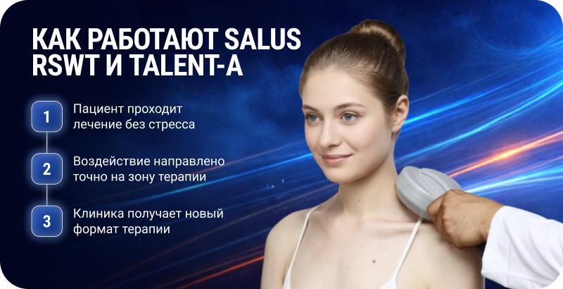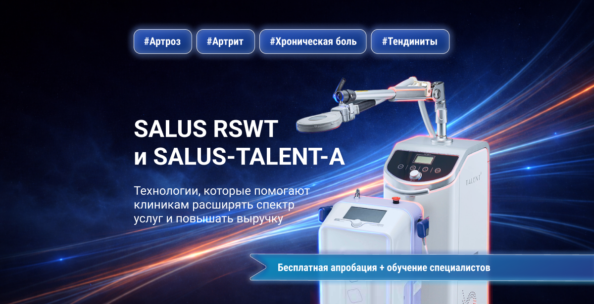 Комбинация радиальной ударно-волновой терапии и глубокой магнитной стимуляции позволяет выстроить более широкое предложение в направлениях боли, восстановления и функциональной реабилитации.SALUS RSWT позиционируется как флагманская система радиальной ударно-волновой терапии для работы с мышцами и фасциями, а SALUS TALENT-A — как мощное решение магнитной стимуляции для ортопедии, реабилитации и урогенитальных задач.
